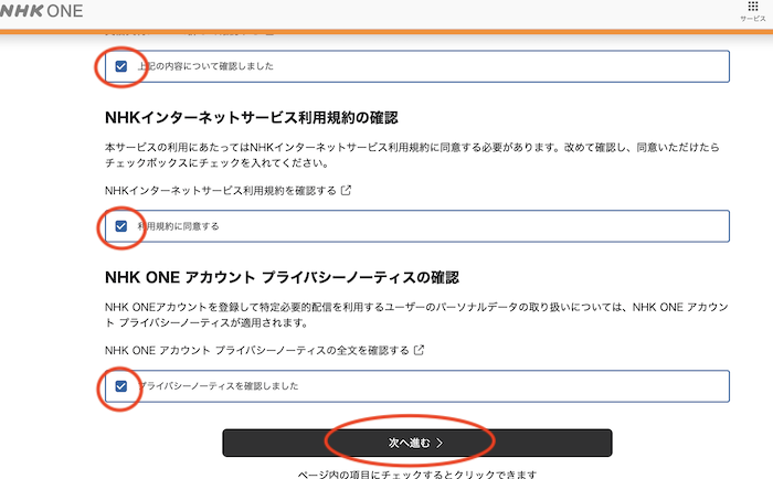 ページ移動後は、利用規約等を確認し、問題なければチェックボックスにチェックを入れ、次のページに進みます。
