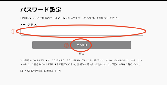 パスワードの設定を行うため、旧NHKプラスで登録していたメールアドレスを入力します。
